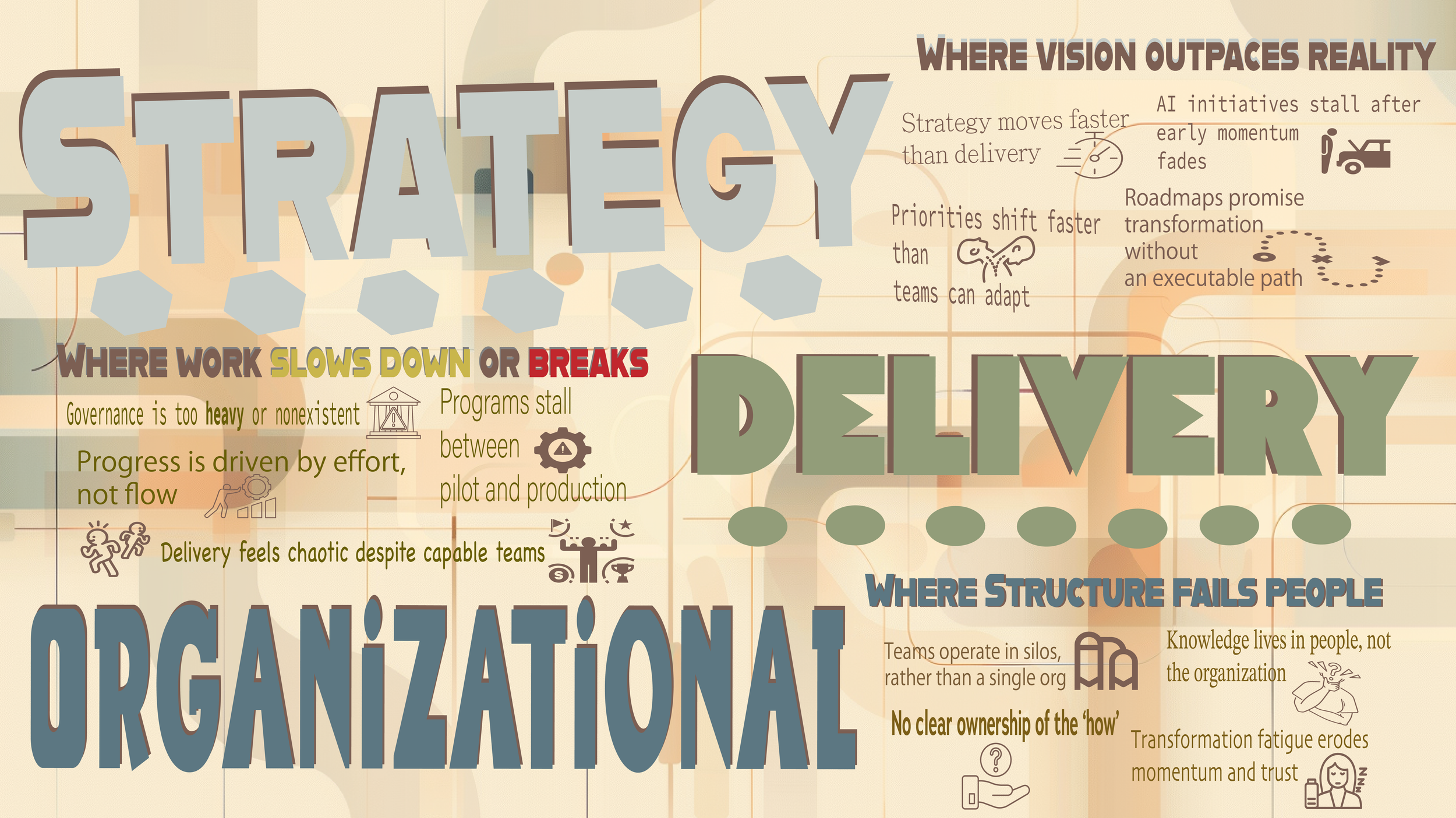 AI initiatives advance more quickly than teams can adapt. Digital roadmaps move ahead of governance. Leaders are expected to deliver results rapidly, even when using outdated delivery models.
